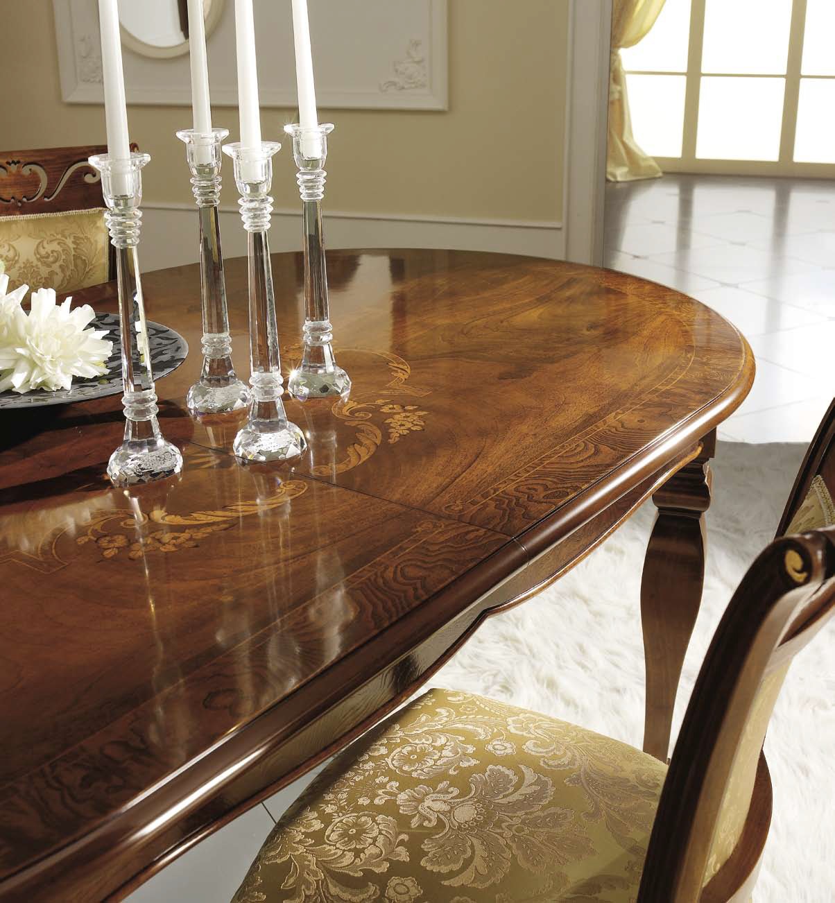 Овальный стол с ножками с двумя центральными удлинениями по 45 см. каждый.