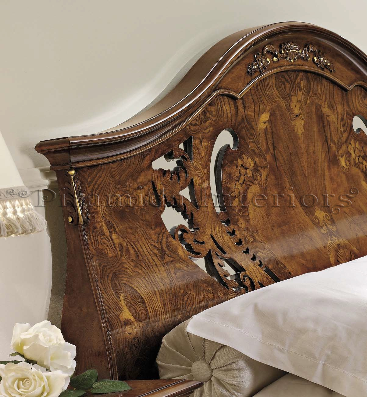 Кровать размера King Size с деревянным изголовьем и изножьем, декорирована резьбой и инкрустацией.
